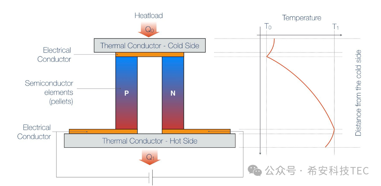 కింది చిత్రంలో చూపిన విధంగా థర్మోకపుల్ యొక్క రెండు చివరలకు థర్మల్ కండక్టర్లు జోడించబడతాయి: పూర్తి TEC ఏర్పడుతుంది. TEC శక్తితో ఉన్నప్పుడు, ఎగువ ఉపరితలం వేడిని గ్రహిస్తుంది, దీనిని కోల్డ్ ఎండ్ అని పిలుస్తారు మరియు గ్రహించిన వేడి Q0. దిగువ ఉపరితలం వేడిని విడుదల చేస్తుంది మరియు వేడి ఉపరితలం అంటారు, విడుదలైన వేడి Q1 ; Q1= Q0+Qtec